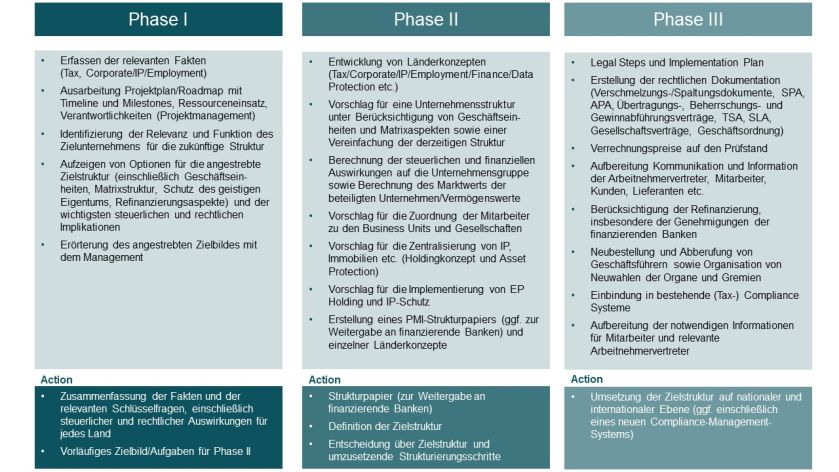 - Auf Grundlage der strategischen Vorgaben sowie der bereits im Rahmen der Due Diligence gewonnenen Erkenntnisse wird ein Grobkonzept erarbeitet und mit den relevanten Stakeholdern abgestimmt. Erst dann beginnt die Detailarbeit mit der Ausarbeitung einzelner Integrationskonzepte (meist) auf Länderbasis. Dafür müssen regelmäßig weitere Informationen aufbereitet werden, die im Rahmen der Due Diligence noch nicht zur Verfügung gestellt wurden. Bei der Konzeptionierung sind eine laufende Abstimmung speziell zwischen den steuerlichen Strukturüberlegungen und den rechtlichen Grenzen (insbesondere des Gesellschafts- und Arbeitsrechts) sowie eine Berücksichtigung globaler Vorgaben wie bspw. die Eingliederung in bestehende IP- oder Real-Estate-Strukturen oder die Eingliederung in Matrix-Organisationen erforderlich. Daneben ist zu beachten, dass sich oftmals auch Interdependenzen zwischen den einzelnen (Länder-)Konzepten ergeben und sich insbesondere bei mehrstöckigen Strukturen auch Auswirkungen auf über- oder untergeordneter Ebene innerhalb einer Konzernstruktur zeitigen können.