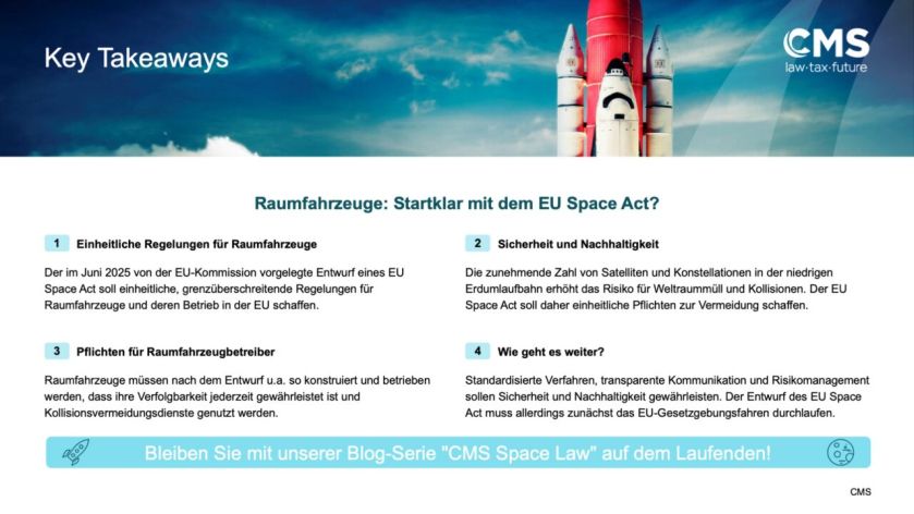 Mit dem EU Space Act möchte die EU-Kommission hohe Maßstäbe für die Sicherheit und Nachhaltigkeit im Weltraum setzen, insbesondere bezogen auf Raumfahrzeuge und ihre Betreiber. Standardisierte Verfahren, transparente Kommunikation und klare Pflichten sollen das Risiko von Kollisionen und die Entstehung von Weltraummüll minimieren. Der derzeitige Entwurf enthält umfassende Anforderungen an die Betreiber von Raumfahrzeugen, vor allem im Hinblick auf Kollisionsvermeidung, Manövrierfähigkeit und auf die Gewährleistung einer effektiven Entsorgung sowie von schnellen und einheitlichen Reaktionen auf Ereignisse von hohem Interesse. Bereits bei der Planung und dem Start müssen Betreiber Analysen zur Umlaufbahn und Maßnahmen zur Müllvermeidung vorlegen. Auch das Risikomanagement während der gesamten Mission, einschließlich der Cybersicherheit, soll im Fokus der neuen Vorschriften stehen. Insgesamt soll der EU Space Act einheitliche Standards schaffen, die zur langfristigen Sicherheit und Nachhaltigkeit der Raumfahrt und des Betriebs von Raumfahrzeugen beitragen. Der Entwurf des EU Space Act muss allerdings zunächst das Gesetzgebungsverfahren der EU durchlaufen, sodass abzuwarten bleibt, welche Regelungen und Pflichten in den finalen Text übernommen werden.
