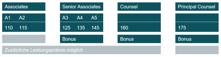 Damit werden die Festgehälter für Berufseinsteigerinnen und Berufseinsteiger um 10.000 Euro pro Jahr erhöht. Bei den Anwältinnen und Anwälten mit mehr Berufserfahrung fällt die Erhöhung mit einem Plus von bis zu 30.000 Euro pro Jahr noch stärker aus. Neben dem Festgehalt wird die persönliche Leistung der Anwältinnen und Anwälte mit Boni honoriert.