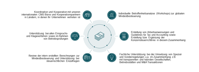 Unser umfassendes Beratungsangebot zur globalen Mindestbesteuerung erstreckt sich dabei u.a. auf: