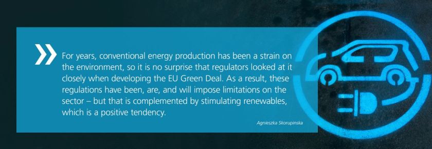 “The energy sector is very much at the heart of the Green Deal and all the regulations around ESG,” says CMS Partner, CEE Head of Environmental Law Practice, and CEE ESG Lead Agnieszka Skorupinska to kick off the conversation. “For years,” she adds, “conventional energy production has been a strain on the environment, so it is no surprise that regulators looked at it closely when developing the EU Green Deal. As a result, these regulations have been, are, and will impose limitations on the sector – but that is complemented by stimulating renewables, which is a positive tendency.”