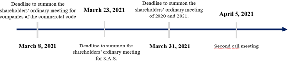 The Decree 434 extended the March-31st deadline only for the 2020 meeting and remained silent regarding the 2021 meeting. As a response, the transitory paragraph of article 6 of the Entrepreneurship Law [2] mandated the National Government to regulate the 2021 meeting.