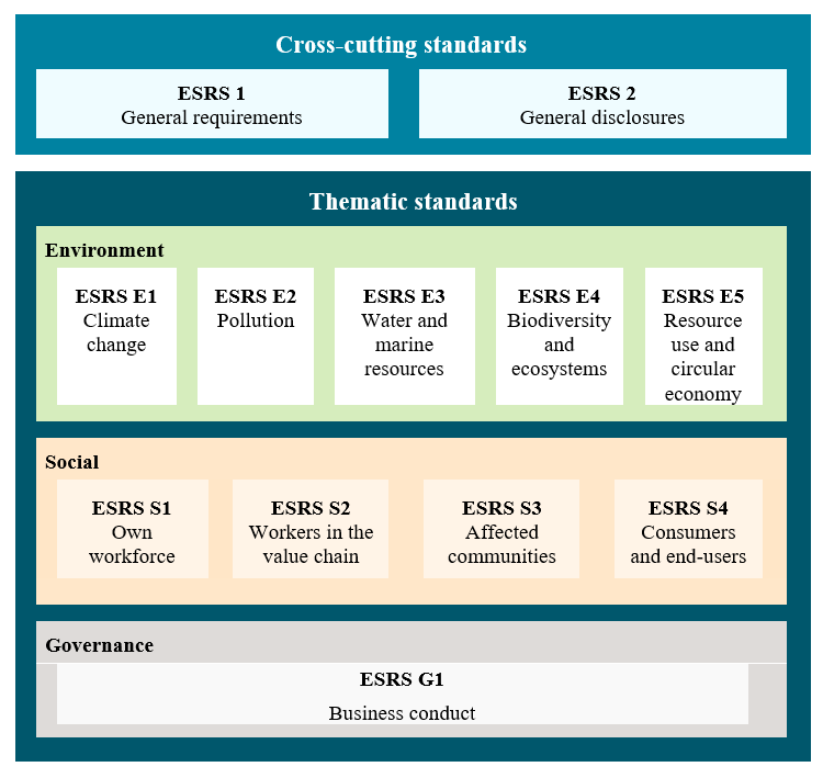 The first set consists of two cross-cutting standards that apply to all sustainability topics and ten topic-specific standards on Environmental, Social and Governance matters. The following graphic provides an overview: