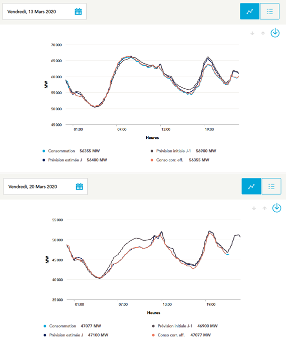 Nonetheless, in relation to peak consumption management (i.e. operations of demand response, which are alternatives to an increase of the production in order to balance the system), it is appropriate to recall that the French regulator (the “CRE”) indicated on 19 March 2020 that demand response solution is not useful in the current period of permanent reduction in electricity consumption: during the first week of lockdown, France consumed 15 to 20% less than in the previous week (see below).