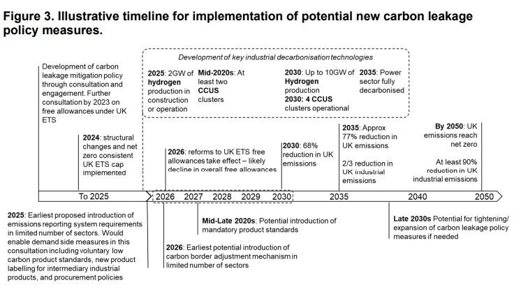 The Consultation considers a range of potential domestic policy measures to mitigate future carbon leakage risk to support decarbonisation in the UK. Key policies for potential implementation from the mid-2020s include: