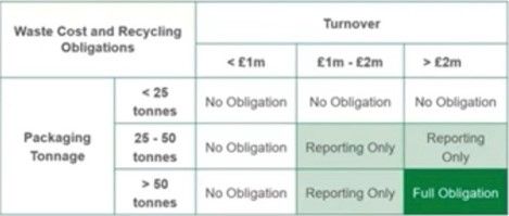 Large producers are those with an annual turnover of more than £2m and who handle more than 50 tonnes of packaging each year. Small producers are those have an annual turnover of more than £1m and handle more than 25 tonnes of packaging per year but are under the large producer criteria (alone or in aggregate if a group). Those with turnover of under £1m or less than 25 tonnes are not obligated.