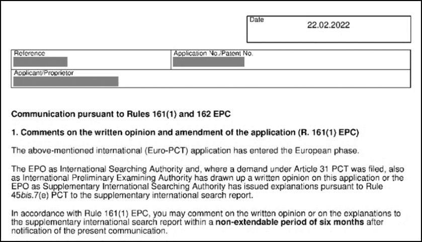 In this example, the R161 EPC communication is dated 22 February 2022. Thus, the addition of 10 days takes it to 4 March 2022. The communication is therefore deemed to have been delivered to the addressee on 4 March 2022. The 6-month period for response starts on 4 March 2022 and the deadline (including the EPO’s 10-day mailing period) for responding to the communication is thus 6 months from 4 March 2022, i.e. 4 September 2022. Since this deadline falls on a Sunday, the response may in fact be filed on the next working day i.e. Monday, 5 September 2022 (Rule 134(1) EPC). |