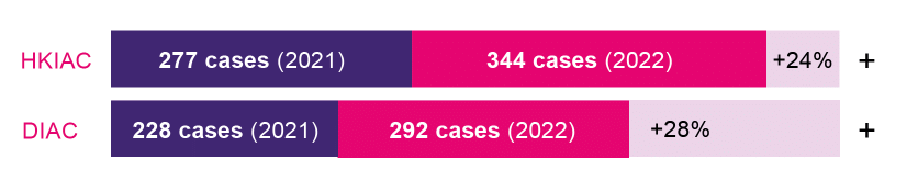 Notable examples of caseloads rising include those at HKIAC – which has experienced an increase of 24% and DIAC which has seen an increase of around 28% as between their 2021 and 2022 figures.