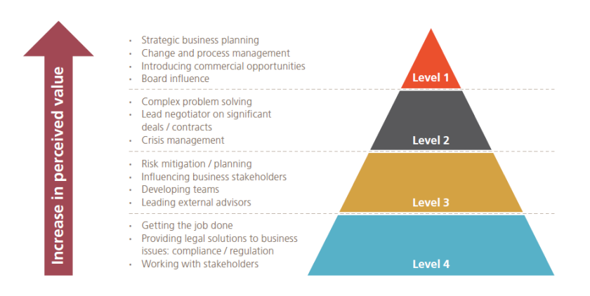 This divides tasks into four levels, according to the value they provide to the business. Level 1 involves tasks with the greatest perceived strategic value to the business. The tasks in the bottom level (Level 4), while essential, are felt to be “bread and butter” work. Many of the GCs we talk to still find the value pyramid useful when considering their role.