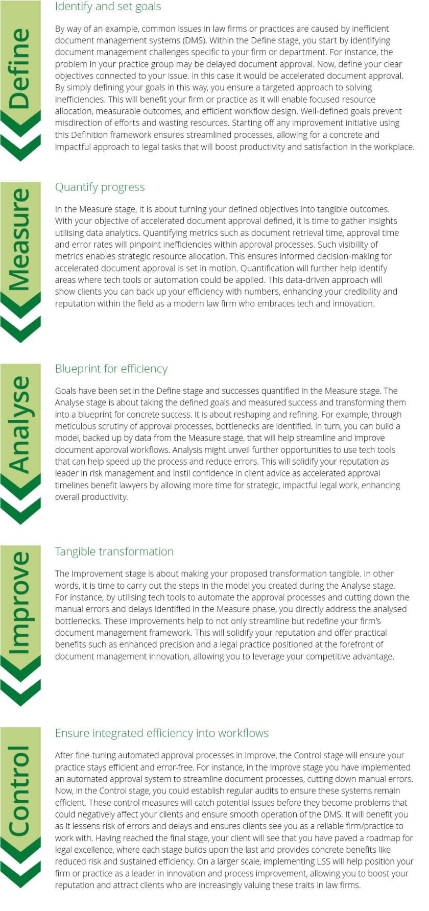 By utilising the LSS model, you can clearly Define, accurately Measure, logically Analyse, tangibly Improve and Control (DMAIC) the impact on workflows and processes you need. The DMAIC framework provides a clear process that can improve daily efficiencies, which can have a compounding and lasting effect on time, costs, client, and value, making LSS an invaluable skill and approach.