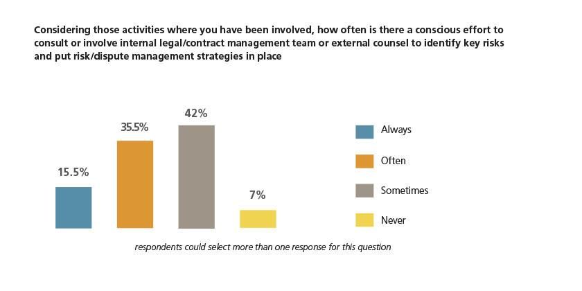 A very small proportion of The CMS Oil and Gas Disputes Survey participants admit to never consulting with internal or external legal teams or contract management groups although only 51% say they will always or often turn to these specialists for help with risk/dispute management strategies.