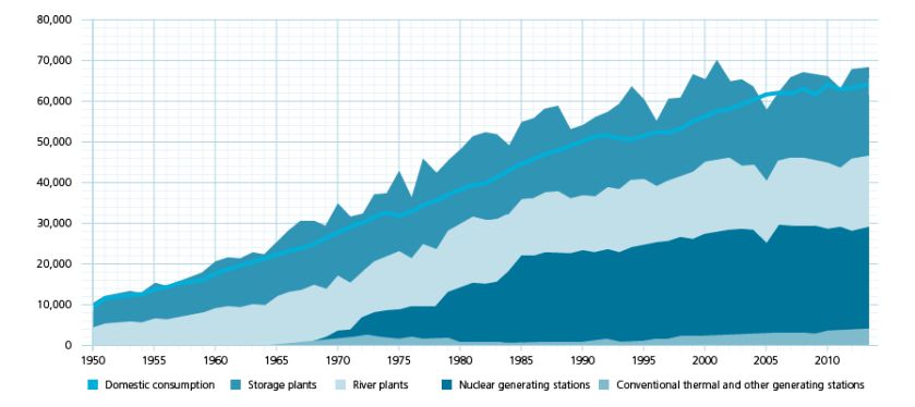 4.1.1 As shown in Figure 2, the supply of electricity in Switzerland is mostly based on hydro power and nuclear power. In 2013, hydropower plants contributed to 57.9% of overall electricity production, followed by nuclear generating stations (36.4%) and conventional thermal and other generating stations (5.7%). Electricity generated by conventional thermal and other generating stations is mostly imported.