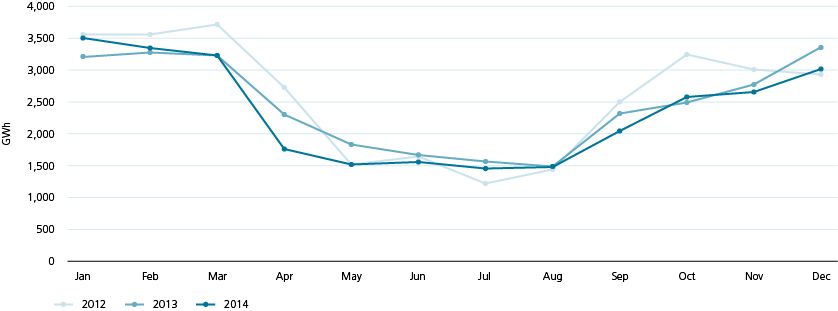 2.5.8 As the price for German and Austrian electricity is quasi equal, the price pattern for auctions at the German-Swiss and Austrian-Swiss border is very similar. Due to the dependency of Switzerland on electricity imports from Germany and Austria in the winter, the electricity prices in Switzerland increase during this period. In the period from 2007 to 2010, the transfer of one MW/h from Germany to Switzerland during the winter period (January – April, November – December) cost EUR 10.9 on average, while in the summer the transfer only costs EUR 1.7 per MW/h (May – October) on average. The transfer of one MW/h from Austria to Switzerland during the winter months (January – April, November – December) was EUR 12.1 on average, while during the summer months the transfer was EUR 1.4 per MW/h (May – October) on average. Electricity prices in Switzerland and Italy are similar in the winters, while Italian prices are higher in summers. The transfer of one MW/h from Switzerland to Italy during the winter months (January – April, November – December) was EUR 4.1 on average, while during the summer months the transfer was EUR 15.4 per MW/h (May – October) on average 18 .
