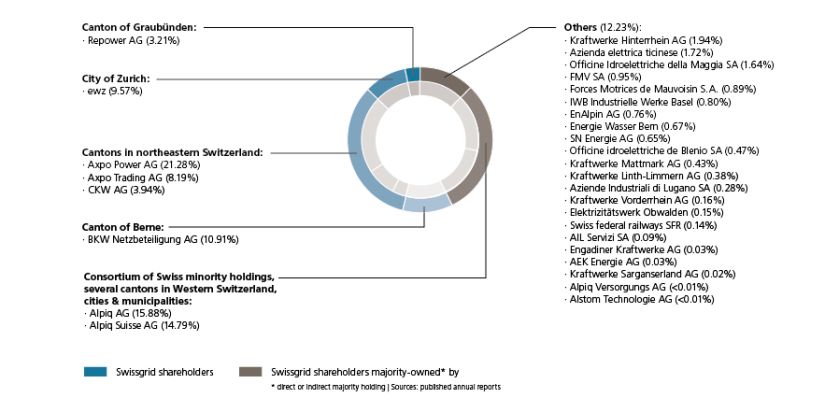 1.3.3 Swissgrid operates the Swiss high-voltage transmission network 3 . Swissgrid is a stock corporation owned by Swiss electricity companies (as set out in Figure 1). These companies are directly or indirectly majority-owned by the cantons and the municipalities. Alpiq is the largest shareholder (owning 30.67%) followed by Axpo and BKW (which own 29.47% and 10.91% of the company respectively). By the end of 2012, all electricity transmission companies had transferred ownership in their transmission assets (relating to the transmission system) to Swissgrid. Swissgrid has a legal mandate to ensure the non-discriminatory, reliable, and efficient operation of the transmission system.