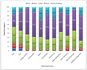Whilst the TOC is the basis to compare cost instead of value, this graph shows that more than 50% of the projects were delivered under the final TOC and only c. 15% were over. It should be noted that this assessment might be isolated to some degree since Alliancing is more than just delivering project outcome at price. Alliance delivery provides an opportunity for scope change and variations without causing significant delay and contractual negotiations but also provides opportunities to deliver outstanding performances in other key result areas, e.g. occupational health and safety, community engagement and stakeholder relations, people training and development and so forth.