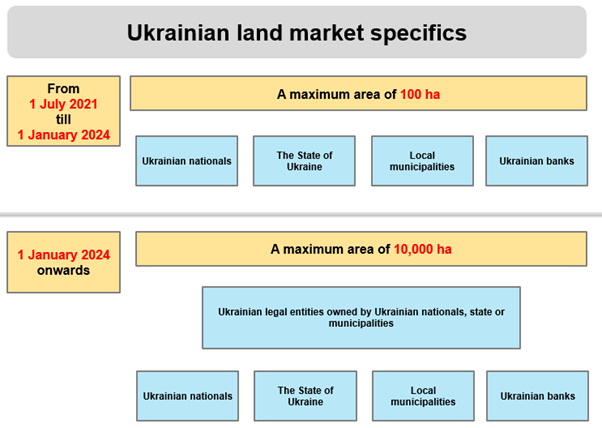 On 1 July 2021, Ukraine officially launched the agricultural land market. During the first stage, Ukrainian citizens were allowed to sell, buy and change the designated purpose of private agricultural land. The area allowed for individual land parcels was limited to 100 hectares. This restriction remained in place until the beginning of 2024 when the land market opened its doors to legal entities.