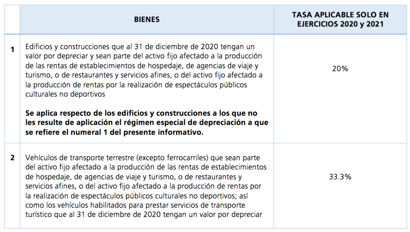 Depreciación aplicable al activo fijo de establecimientos de hospedaje, agencias de viaje y turismo, restaurantes y otros