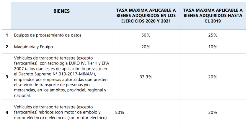 Mediante el Decreto Legislativo No. 1488 publicado en el Diario Oficial “El Peruano” el 10 de mayo del 2020 se ha establecido un régimen especial de depreciación tributaria y se han modificado las tasas de depreciación contenidas en el Reglamento de la Ley del Impuesto a la Renta para bienes que se adquieran durante los ejercicios 2020 y 2021. A continuación les alcanzamos los principales aspectos de la referida norma que entrará en vigencia a partir del 1 de enero del ejercicio 2021: