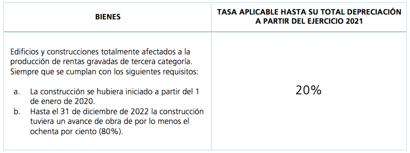- Tratándose de edificios y construcciones que empiecen a depreciarse en el ejercicio gravable 2020, se aplica la tasa de depreciación del veinte por ciento (20%) anual a partir del ejercicio gravable 2021, de ser el caso, excepto en el último ejercicio en el que se aplica el porcentaje de depreciación menor que corresponda.