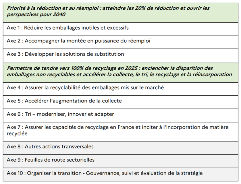 L'article 7 de la loi AGEC prévoit qu'"une stratégie nationale pour la réduction, la réutilisation, le réemploi et le recyclage des emballages en plastique à usage unique est définie par voie réglementaire avant le 1er janvier 2022".