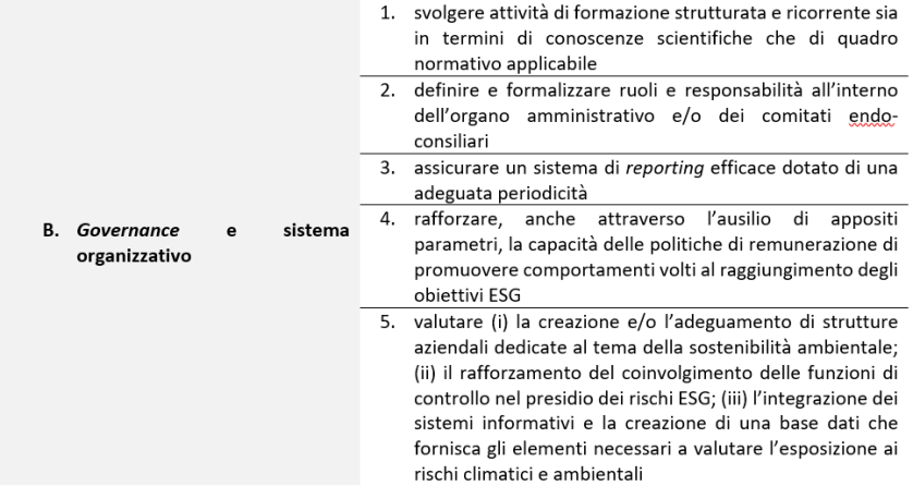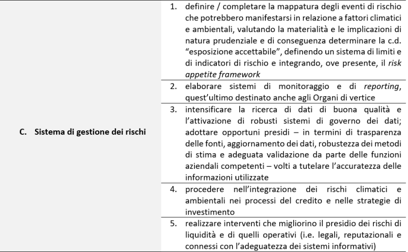 Nel seguito si offre una sintetica panoramica delle azioni che i soggetti vigilati sono invitati a considerare al fine di ottemperare al siffatto obbligo, suddividendo le stesse nell’ambito di tre macro-aree tematiche che sono state oggetto di attenzione da parte dell’Autorità: (i) il modello di business e la strategia; (ii) la governance e il sistema organizzativo; (iii) il sistema di gestione dei rischi.